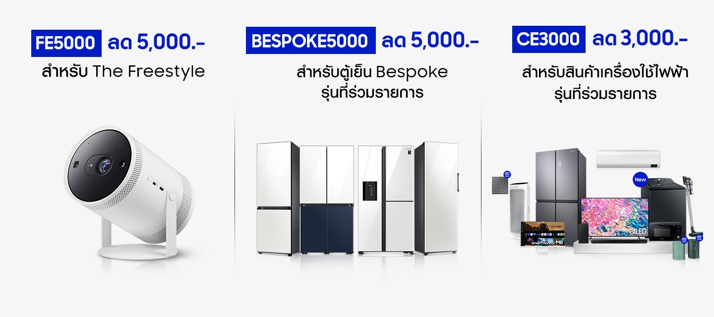2. เงื่อนไขส่วนลดเมื่อใส่โค้ด FE5000 และ BESPOKE5000 เพื่อรับส่วนลด 5,000 บาทสำหรับสินค้า รุ่นดังต่อไปนี้