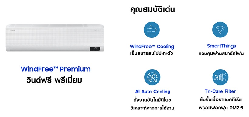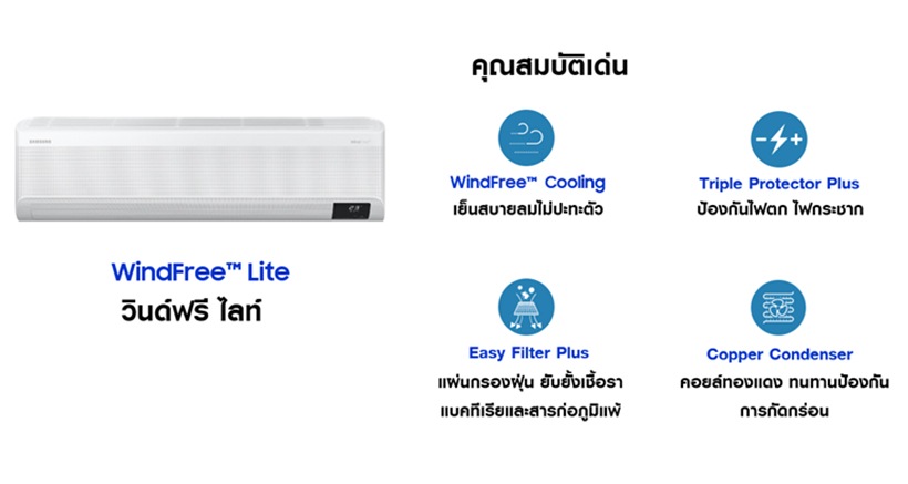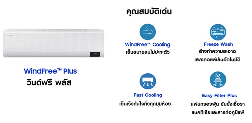 - WindFree™ Cooling คือ เทคโนโลยีที่เย็นสบายลมไม่ปะทะตัว โดยลมที่กระจายออกผ่านรู 23,000 รู ทำให้รู้สึกเย็นสบายไม่หนาวจนเกินไป