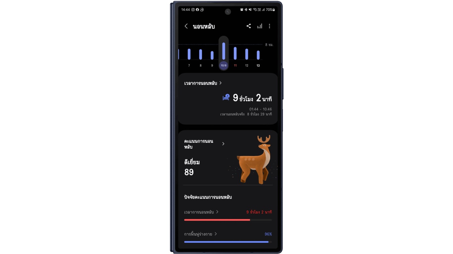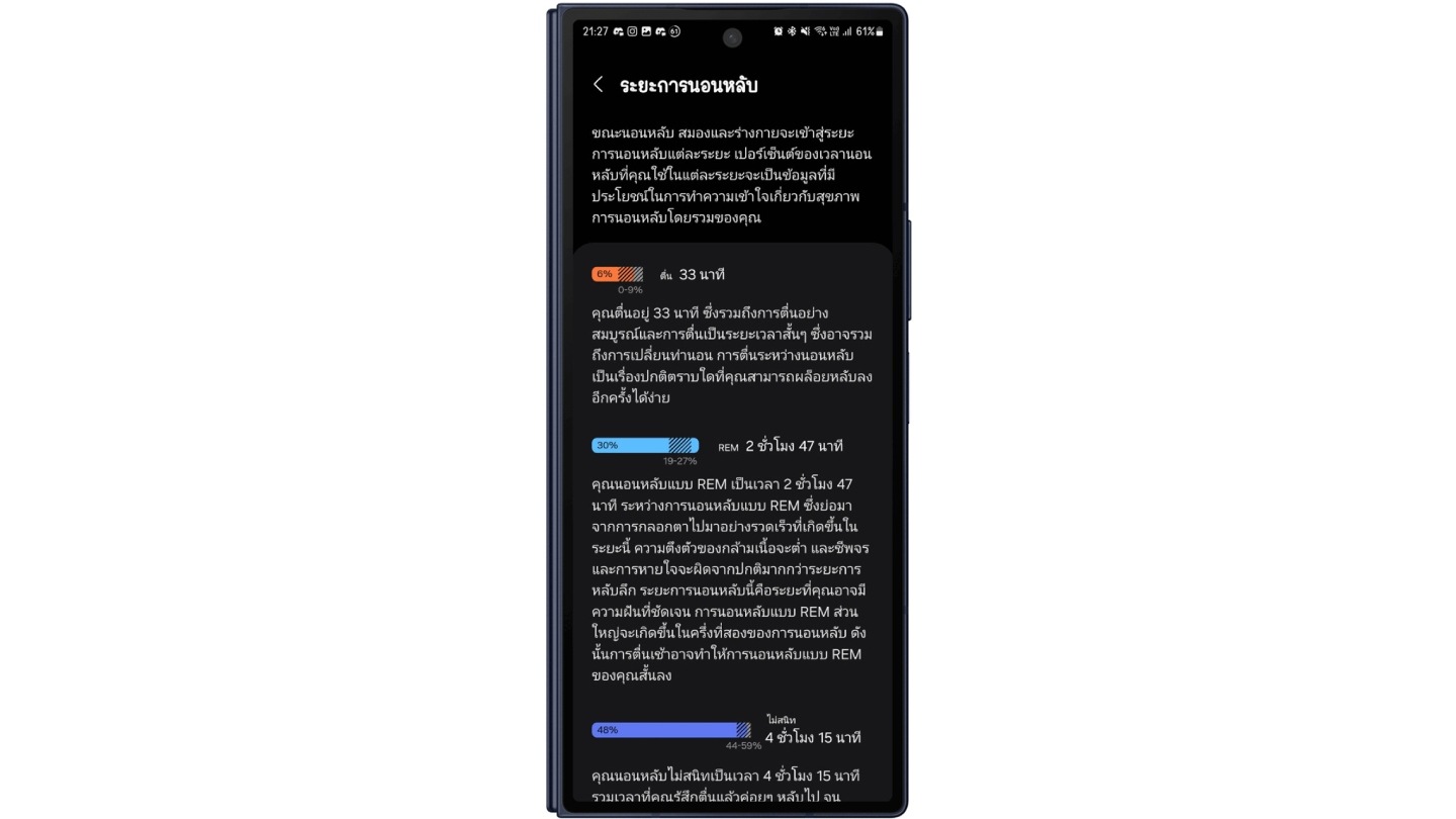“ชั่วโมงการนอนที่ได้คุณภาพ” จากที่ผมได้ใส่ Galaxy Watch Ultra เพื่อดูการนอนหลับในแต่ละคืน ทำให้รู้เลยว่าผมหลับลึกไป 1 ชั่วโมง 27 นาที เป็นช่วงที่ร่างกายได้รับการฟื้นฟูอย่างมีประสิทธิภาพ ซึ่งชั่วโมงในการหลับลึกของคนทั่วไปที่เหมาะสมจะอยู่ประมาณ 13% – 23% ของการนอนแต่ละคน ไขข้อสงสัยให้ใครหลายคนว่าทำไมนอน 10 ชั่วโมง หรือ 12 ชั่วโมง พอตื่นแล้วยังรู้สึกเพลียหรือง่วงอยู่