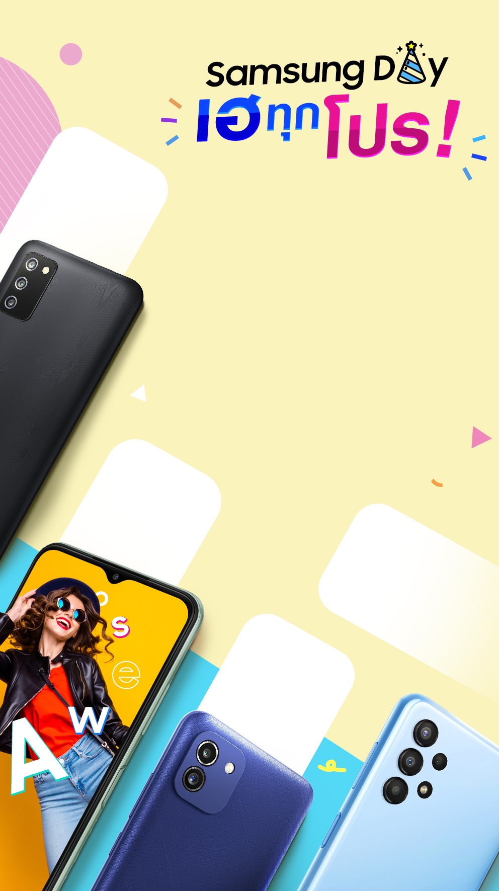 - ลูกค้ารับส่วนลด 1,000 บาท เมื่อซื้อ Galaxy A22 5G จากราคาปกติ 8,299 บาท เหลือ 7,299 บาท หรือ ลูกค้ารับส่วนลด 500 บาท Galaxy A13 จากราคาปกติ 6,499 บาท ลดเหลือ 5,999 บาท หรือ ลูกค้ารับส่วนลด 200 บาท Galaxy A03 จากราคาปกติ 4,599 บาท ลดเหลือ 4,399 บาท หรือ ลูกค้ารับส่วนลด 150 บาท Galaxy A03s จากราคาปกติ 4,399 บาท ลดเหลือ 4,249 บาท ที่ Samsung Experience Store, samsung.com และร้านค้าที่ร่วมรายการ ระหว่างวันที่ 7 พฤศจิกายน 2565 - 30 พฤศจิกายน 2565 เท่านั้น