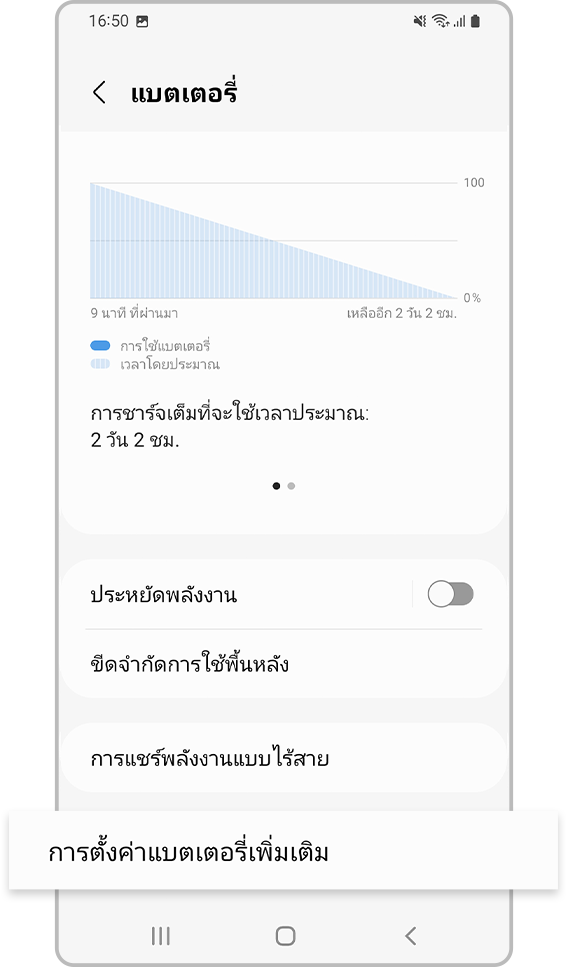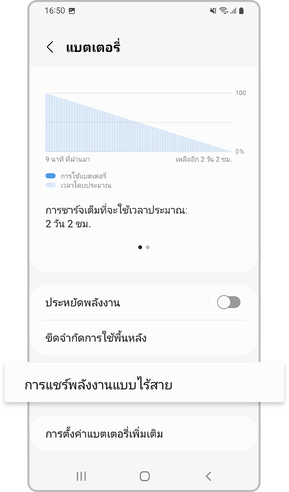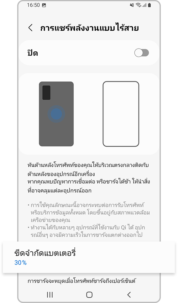 คุณสามารถตั้งค่าอุปกรณ์ให้หยุดการแชร์พลังงาน เมื่อพลังงานแบตเตอรี่ที่เหลืออยู่ลดลงต่ำกว่าระดับที่กำหนด
