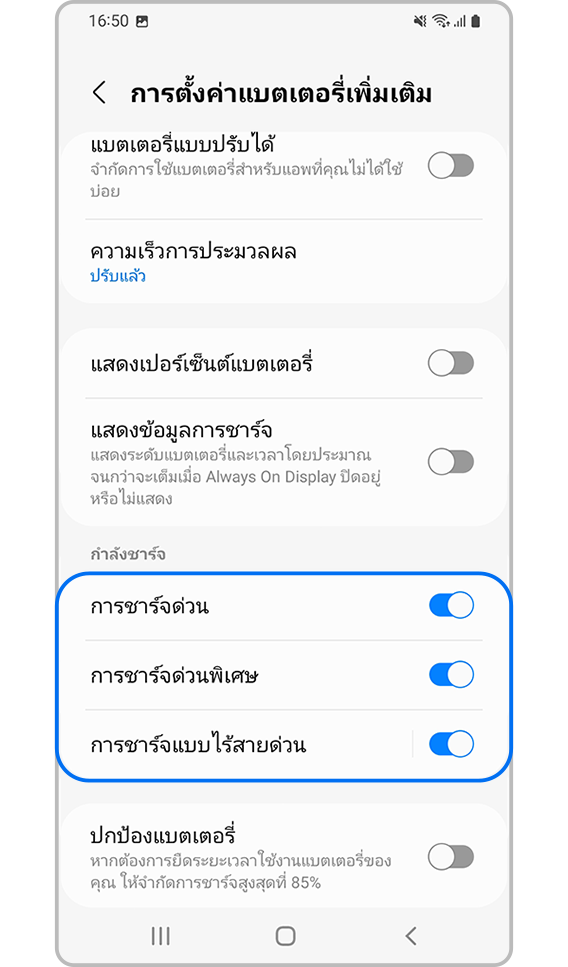 - การชาร์จด่วน: ในการใช้ฟีเจอร์การชาร์จด่วน ให้ใช้ที่ชาร์จแบตเตอรี่ที่รองรับการชาร์จด่วนแบบปรับได้ โดยจะต้องมีข้อความ 'Adaptive Fast Charging' พร้อมด้วยไอคอนการชาร์จอยู่บนที่ชาร์จไฟ