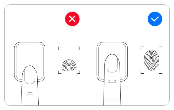 - ขอแนะนำให้ลงทะเบียนลายนิ้วมือของคุณในตำแหน่งที่คุณวางนิ้วมือได้อย่างสะดวกสบาย เพื่อให้แน่ใจว่าลายนิ้วมือที่ถูกอ่านตรงกับลายนิ้วมือที่ลงทะเบียนไว้ในอุปกรณ์ ในการลงทะเบียนลายนิ้วมือของคุณอีกครั้ง ให้เริ่มต้นที่ตรงกึ่งกลางของเซ็นเซอร์ และย้ายไปทางด้านบนและล่าง ซ้ายและขวา