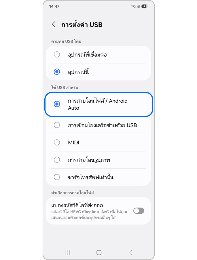 การเปลี่ยนแปลงการตั้งค่า USB (สำหรับการถ่ายโอนไฟล์)