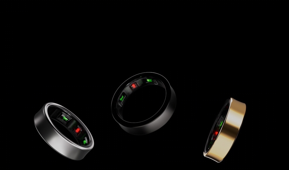 Öne doğru bakan bir Galaxy Ring beliriyor. Üç sensörü ortaya çıkarmak için dönüp kıvrılıyor.