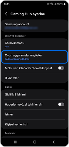 Not: Samsung One UI Home dışında bir 3. taraf ev başlatıcısı kullanıyorsanız, Gaming Hub ayarlarında 'Oyun uygulamalarını göster' seçeneği görünmez. Bu özellik yalnızca One UI Home'da çalışır.