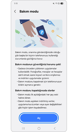 - Bakım modu etkinleştirildiğinde kişisel verilerinize erişilemez, sadece önceden yüklenmiş uygulamalar kullanılabilir.