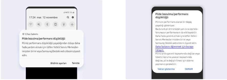 Normalde, pilin ömründe dikkate değer bir azalma veya cihazda beklenmedik kapanmalar görülmesi gibi işaretler pilde bozulma olduğu anlamına gelir. Samsung Galaxy telefonunuzun güvenlik mekanizması, cihazı korumak için cihazı kapatır veya güvenlik mekanizmasını etkin hale getirir.
