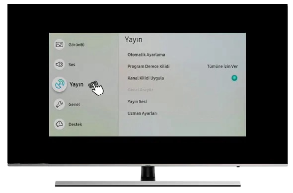 1. Kumandanızdan menu tuşuna basın. Ardından Yayın/Kanal sekmesine giriş yapın.