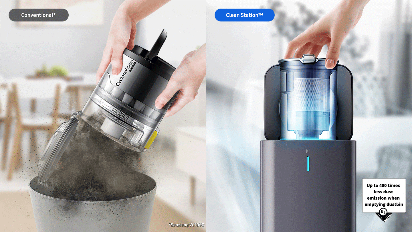 * 根據美國 UL 認證,集塵筒在 PM10 粉塵濃度情況下,進行 Samsung VC7000 機型的粉塵排放量對比測試。吸塵效能以實際操作為準。