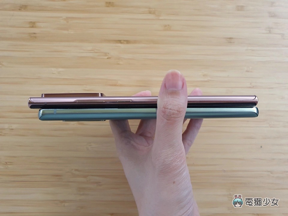 雖然說看起來沒有差很多,192 克的重量在帳面上看起來也只比 208 克的 Galaxy Note20 Ultra 5G 輕一些,但拿起來覺得超級輕巧又順手~可能跟機身配重也有關吧?另外 Galaxy Note 20 5G 的機身也比 Ultra 圓潤一點。我覺得只就手感來說,Galaxy Note20 5G是略勝 Galaxy Note20 Ultra 5G 一籌的