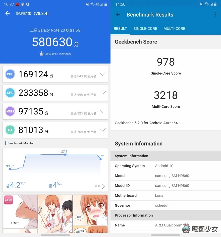 身為一支旗艦機,Galaxy Note20 Ultra 5G 當然是要能帶來良好的使用體驗,不論是在工作或是日常的使用上。它搭載了驍龍 865+ 處理器、12GB RAM、UFS 3.1 儲存空間,在效能和使用順暢度上是非常好的。我把安兔兔和 Geekbench 跑分都列出來