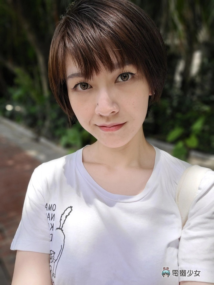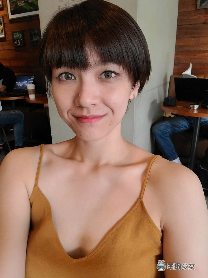 前鏡頭是 1000 萬畫素,我覺得有拍出我想要的感覺,就是和對主鏡頭的要求相同:要看起來皮膚好,但又要適度保有肌膚紋理,不能有美肌太嚴重的感覺 XD 同時臉部沒什麼變形的狀況,廣度也還滿夠的