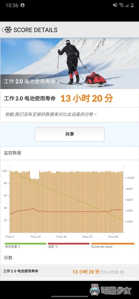 我把螢幕開啟 2K 解析度,亮度大概三分之一,測試 PCMark 從電量 100% 到 20%,結果是 13 小時,另外要是開啟 120Hz 選項,結果是 11 小時,所以 1080P 120Hz 螢幕,是比 2K 60Hz 螢幕來得更耗電的~但因為使用的流暢度還是有差,我還是會選擇使用 120Hz 螢幕