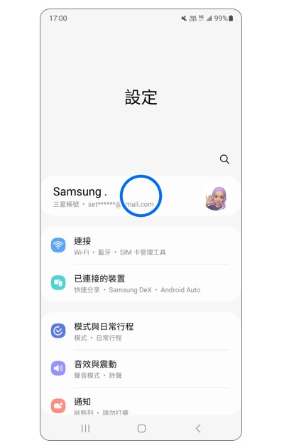 · 聯絡人 (三星帳號):聯絡人、電子郵件地址與名片
