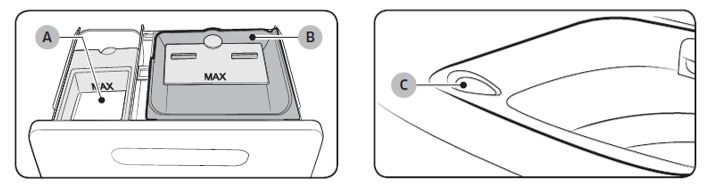 - 液體洗劑分隔盒 (B):加入建議量的液體洗劑到分隔盒。如要使用粉狀洗劑,請將液體洗劑分隔盒取出。