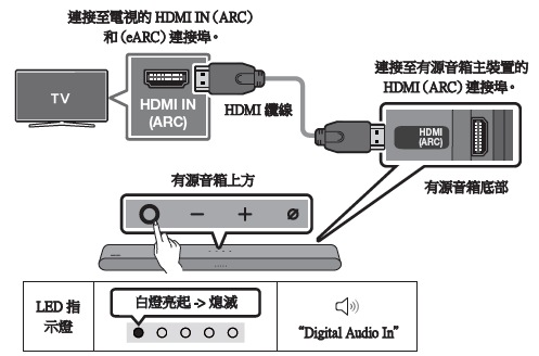 • 若電視聲音不是輸出,請按 Soundbar 頂端的多功能按鈕或是遙控器上的訊號源按鈕,以選取 “Digital Audio In” 模式。