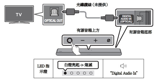 在關閉電視和 Soundbar 的情況下,連接 Soundbar 上的 DIGITAL AUDIO IN(OPTICAL) 連接埠,