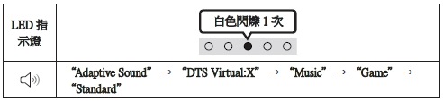 您可以按下按鈕選擇想要的音訊模式。 每當模式變更時,多彩 LED 會閃爍白色光。