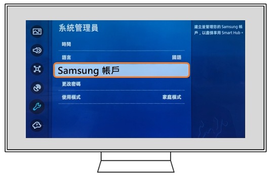 在三星電視中登入三星帳號即可享有更多服務,例如:下載應用程式、同步媒體瀏覽器等等。