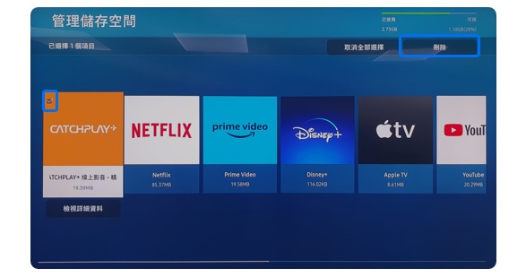進入裝置維護選單中的管理儲存空間,您可以檢查和整理電視上目前正在使用的資料。