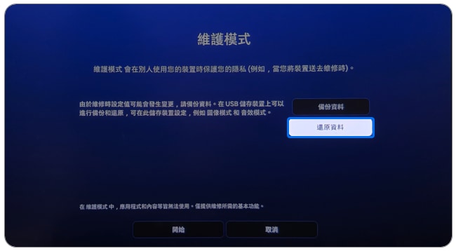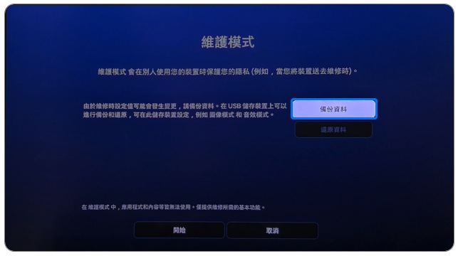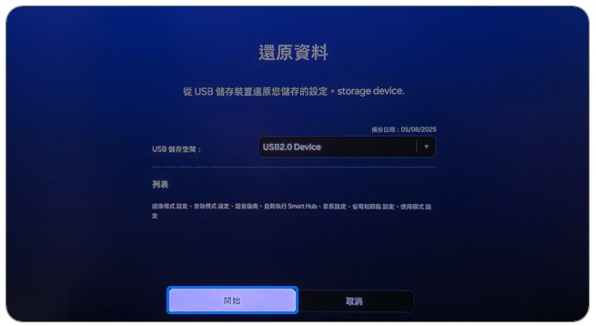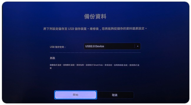 在USB 儲存裝置上可以進行備份和還原,可在此儲存裝置設定,例如圖像模式和音效模式。