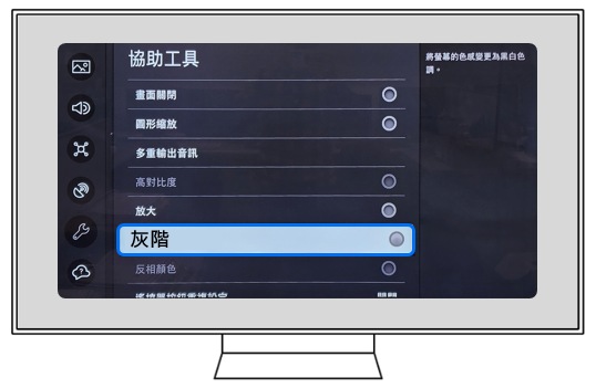 ● 灰階模式:一種顯示設定,將螢幕上的顯示內容轉換成黑白或灰色調,有助於減少眼睛疲勞或專注於閱讀內容。