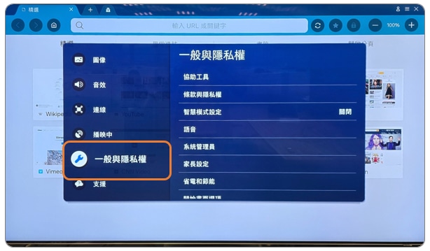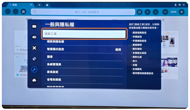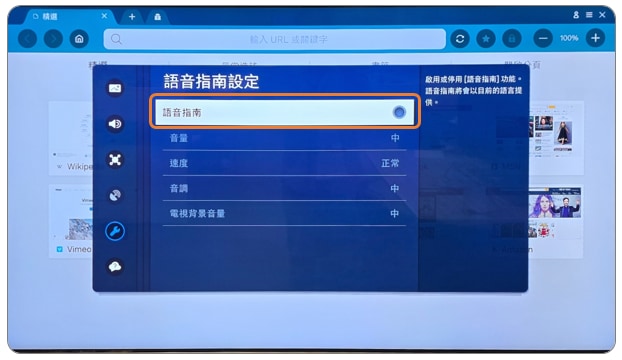 若開啟「語音指南」功能,電視將會透過語音的方式描述功能表,故而關閉游標。