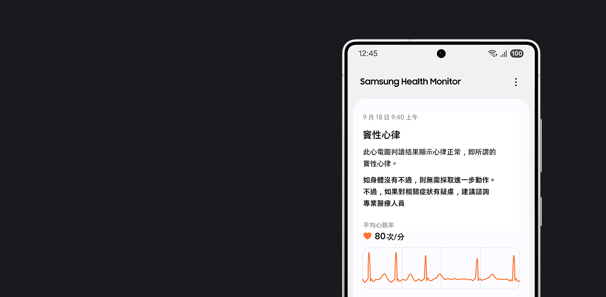 * 必須有 Samsung Galaxy 智慧手機 (Android P OS 或以上版本) 與 Galaxy Watch 才能使用 Samsung Health Monitor 應用程式。更多資訊和提供相關服務國家/地區的最新更新,請至 https://www.samsung.com/tw/apps/samsung-health-monitor 網頁查看。