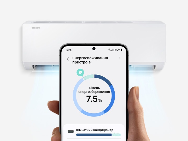 18. Внутрішнє тестування моделі AR07D9181HZ3 показало зменшення частоти роботи компресора на 27% при мінімальному навантаженні – з 15 до 12 об/сек (може відрізнятися залежно від моделі). Тестування проводилося в лабораторії побутового середовища Samsung площею 132 м² при температурі 35°C/24°C (сухий/вологий термометр, стандарт KS C 9306: кондиціонери). Для використання потрібен застосунок SmartThings та обліковий запис Samsung. Фактичні показники економії можуть відрізнятися залежно від умов.