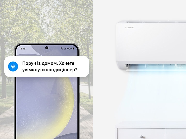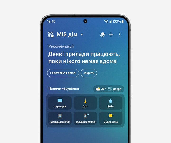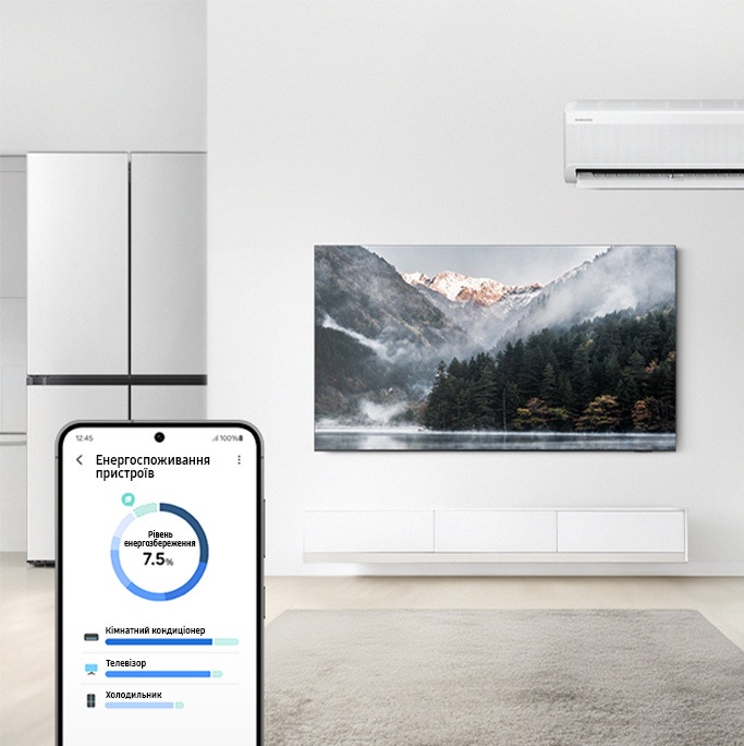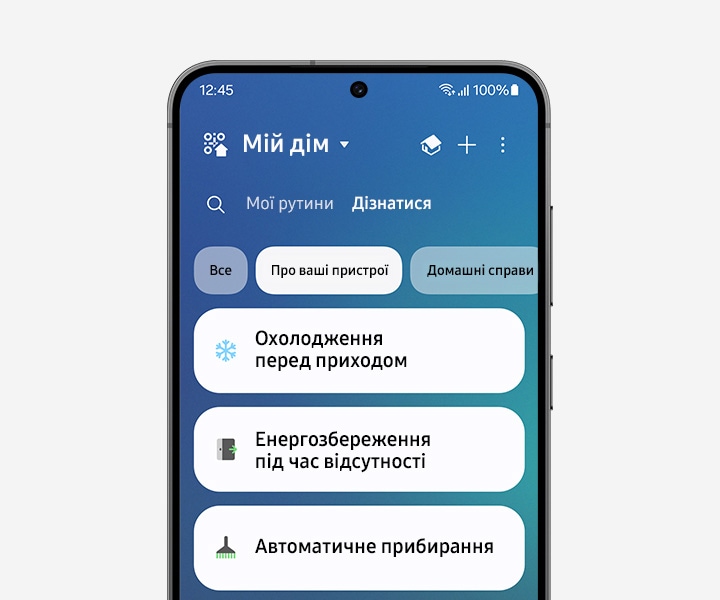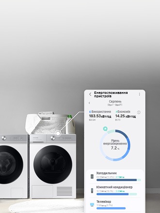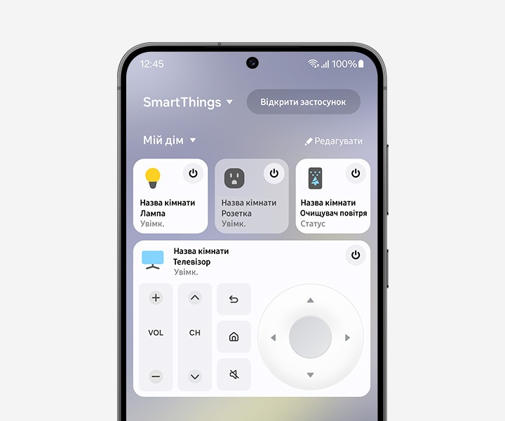 * Щоб користуватися SmartThings, завантажте застосунок із Galaxy Store, Google Play Store або Apple App Store. Для роботи застосунку SmartThings потрібна ОС Android 10 або вище, мінімум 3 ГБ оперативної пам’яті чи iOS 15 або вище. Вимоги до операційної системи та конфігурація екрана застосунку можуть змінюватися з оновленнями.