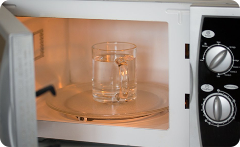 Налийте в склянку 100-150 мл води кімнатної температури та поставте її в камері по центру тарілки, що обертається. Потім установіть режим «НВЧ», максимальну потужність нагріву (зазвичай 800 - перевірте в Інструкції користувача детальніше) та запустіть на 3 хвилини.