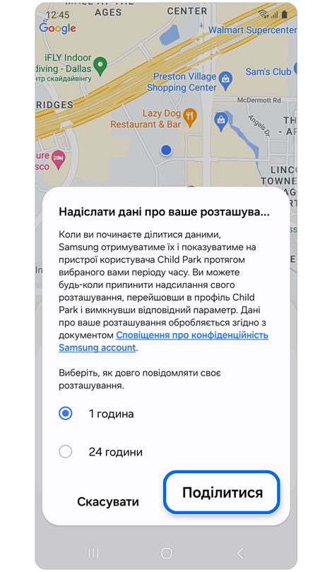 Використовуйте програму Samsung Find, щоб поділитися своїм розташуванням із друзями, дитиною, родиною та іншими контактними особами