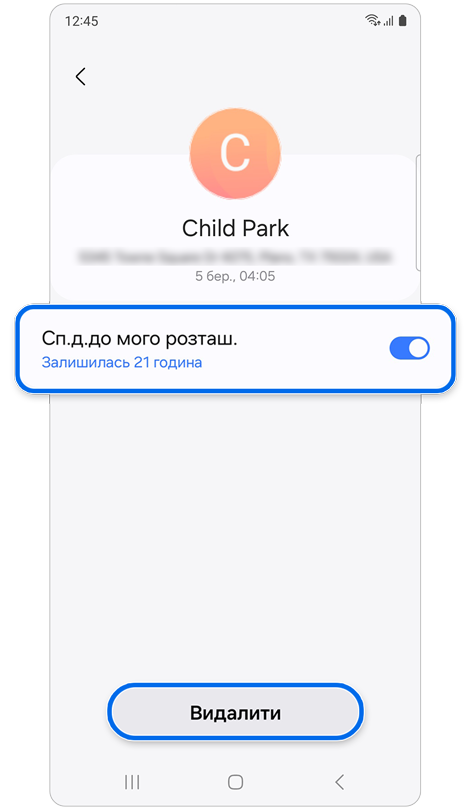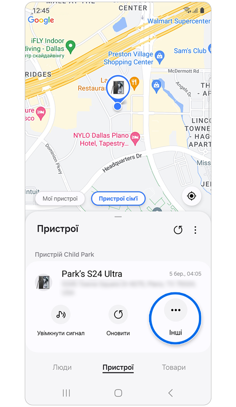 Програма Samsung Find може бачити розташування дитини на батьківському пристрої, якщо дитина ввійшла в програму Samsung Find за допомогою батьківського облікового запису та надіслала своє розташування батьківському обліковому запису.