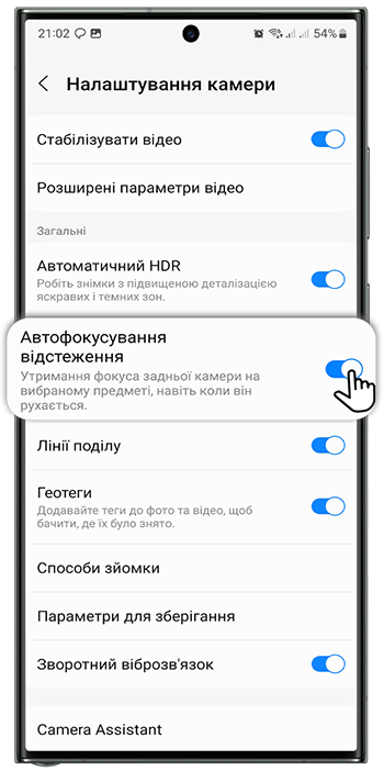 Коли ви хочете зробити знімок, ваша камера повинна сфокусуватися на об’єкті, коли ви торкаєтеся його на екрані. Якщо ввімкнуто стеження за автофокусом, ваша камера буде зафіксована на людині чи предметі, якого ви торкалися, протягом 3 секунд. Оскільки вона фокусується на одному предметі, може здатися, що камера фокусується не на всій сцені. Цьому можна запобігти, вимкнувши автофокус відстеження. Виконайте наведені нижче дії, щоб вимкнути функцію стеження за автофокусом.