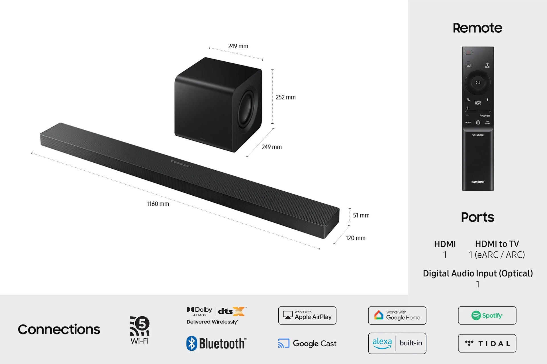 Ditch the clutterSimplify your life with a single remote. Samsung's Smart Remote lets you effortlessly control multiple connected devices with just one click. It's not just for your soundbar; it can link up with various compatible devices from your TV to your set-top box.11
