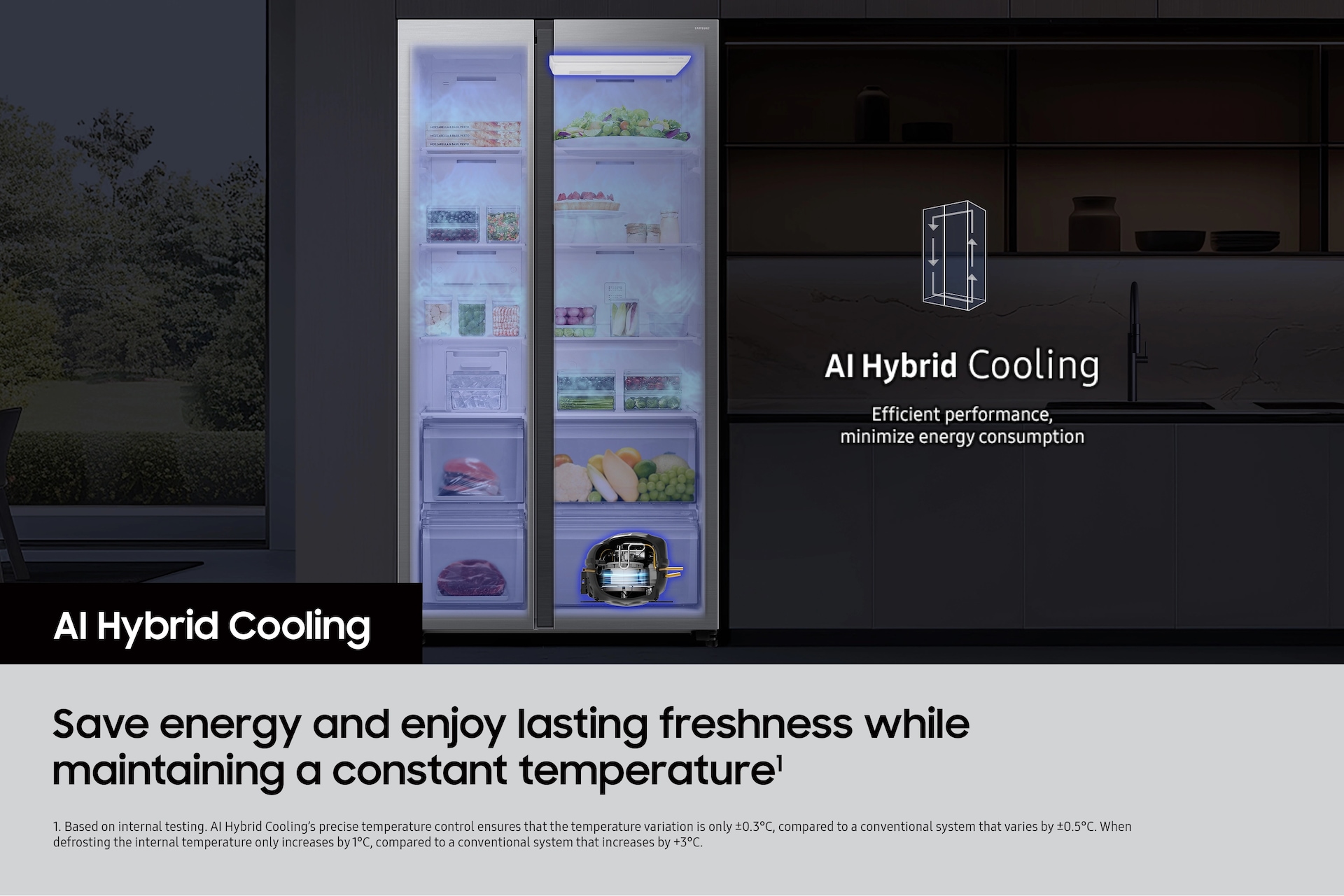 *Based on internal testing. AI Hybrid Cooling’s precise temperature control ensures that the temperature variation is only ±0.3°C, compared to a conventional system that varies by ±0.5°C. When defrosting the internal temperature only increases by 1°C, compared to a conventional system that increases by +3°C.