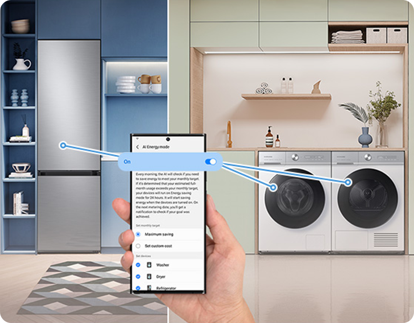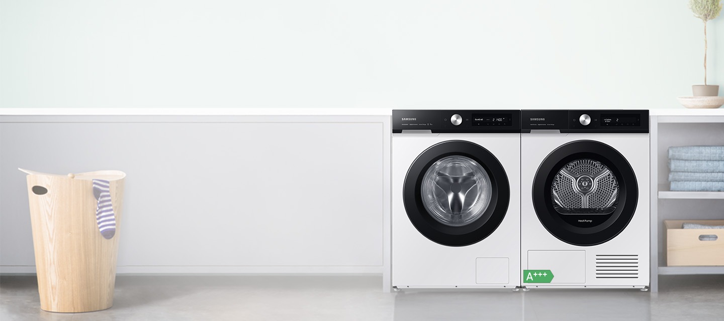 1. £1271.13 saving based on 5 year running costs of Samsung A rated Washing Machines (£80.39 saving) compared to the average energy use of other manufacturer D rated washing machines (most purchased energy rating 2023, GFK), using 284 cycles/yr on an eco 40-60 program and Samsung A+++ Heat Pump Tumble Dryers (£1190.74 saving) versus the average energy usage of condenser tumble dryers, completing 260 cycles per year (Based on the EU Energy Label Standard). Comparison made against appliances sold in major UK retailers as of 21/09/23 as determined by Youreko, using an average 27.35p tariff.