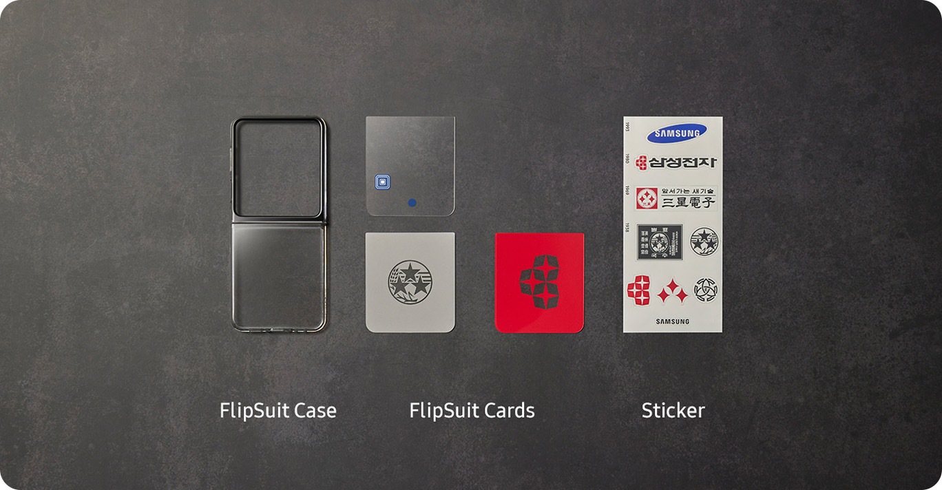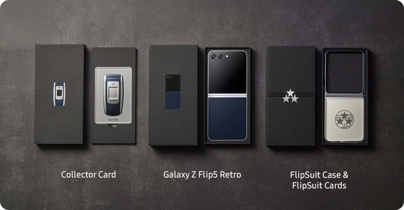 The Special Edition box includes Galaxy Z Flip5 Retro, SGH-E700 Collector Card with a unique identification number, 1 FlipSuit Case, 3 types of FlipSuit Cards and a sticker. 2