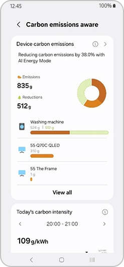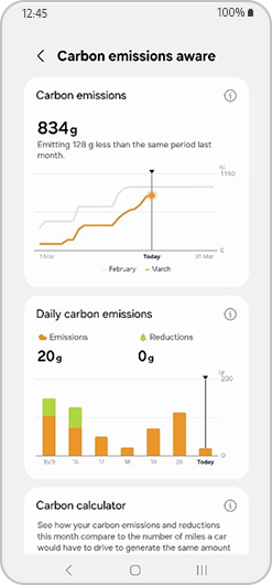 To view carbon emissions, reductions and reduction rates by month and device, tap Carbon emissions aware.