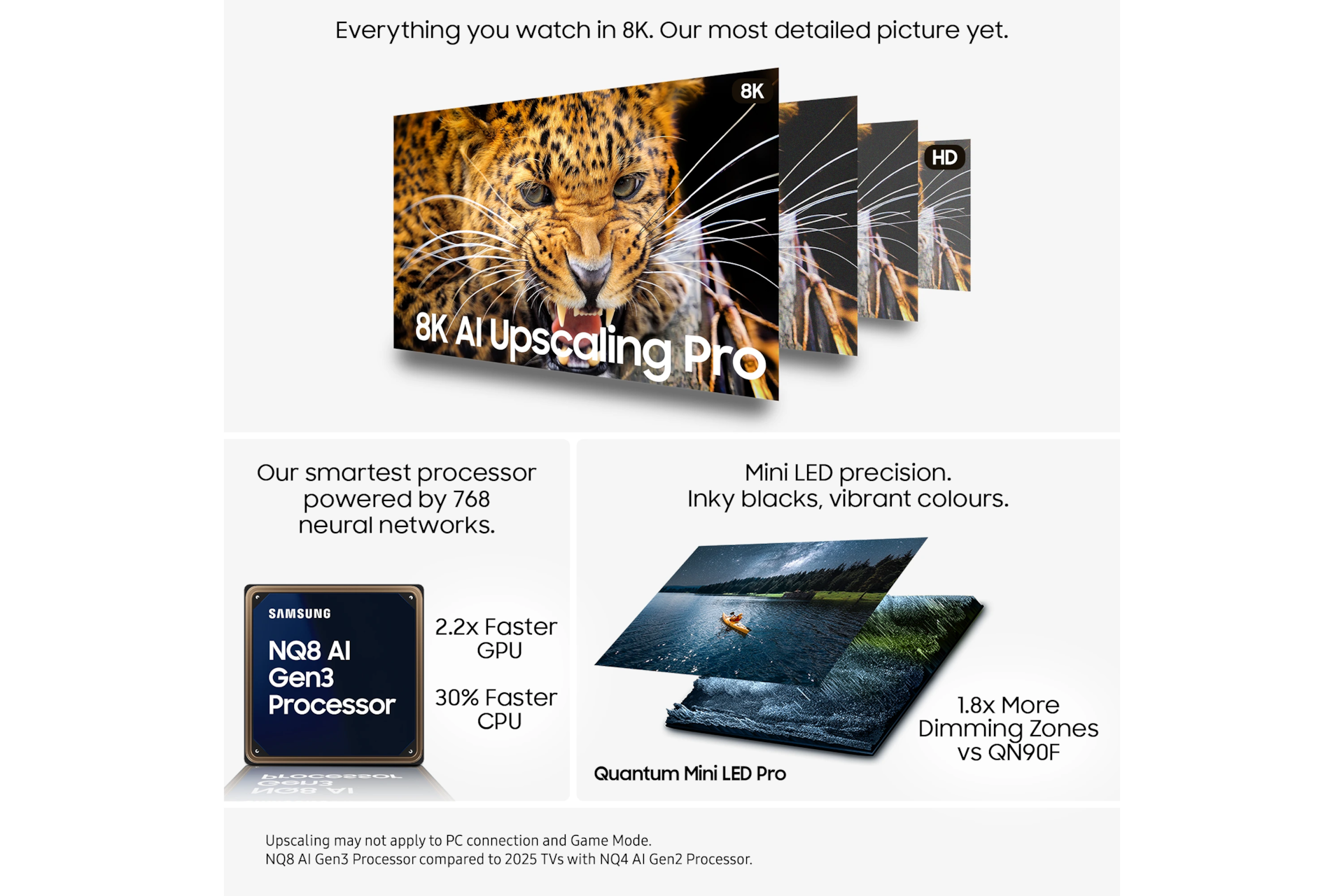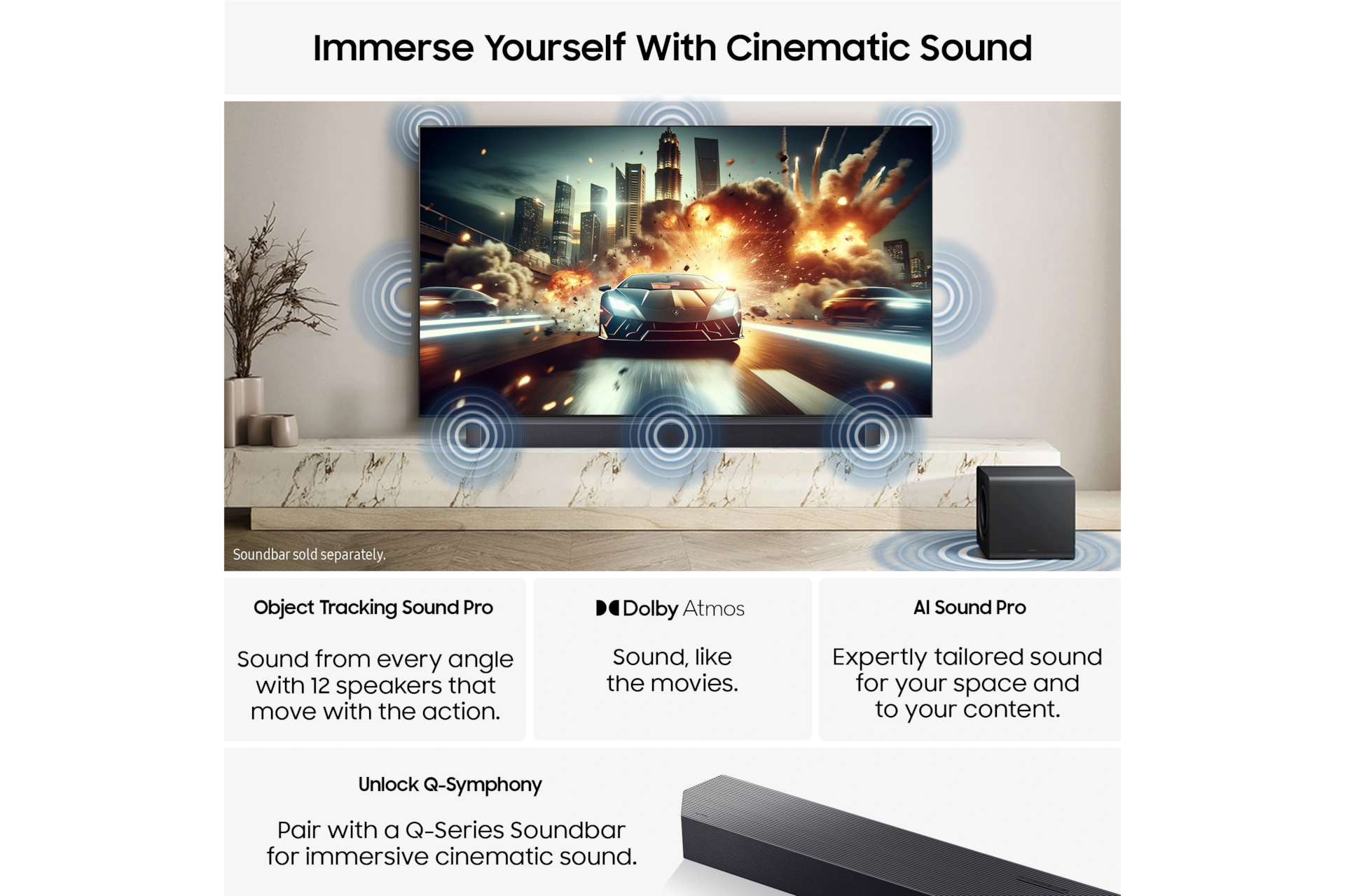 Experience our most advanced Quantum Mini-LED Pro, powered by Quantum Matrix Technology Pro for ultra-precise light control—delivering true blacks, vivid colours, and incredible brightness for a picture that’s rich in every detail.6