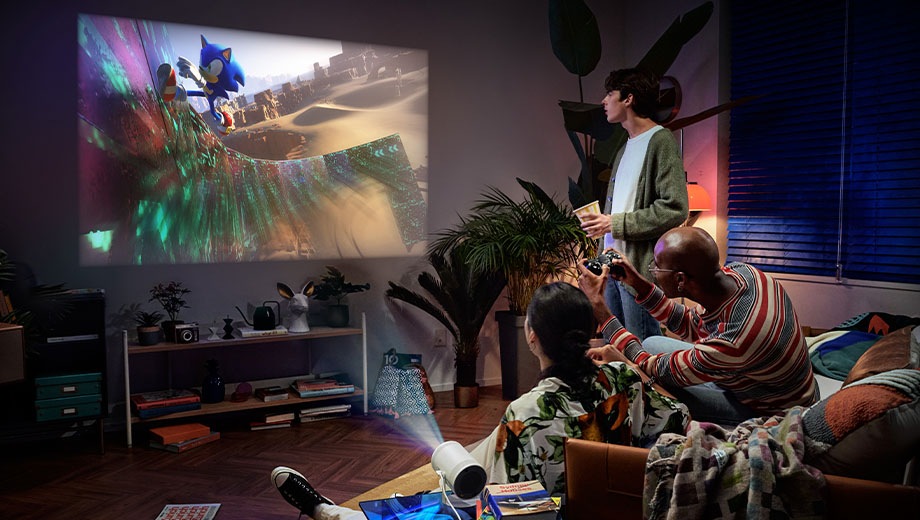 Create a Play Mode routine in the SmartThings App,¹ and your space is instantly transformed. Your Philips Hue Light² syncs with your screen, matching every frame’s color and mood. The Freestyle 2nd Gen with Gaming Hub³ switches from ambient mode to full projection, turning your walls into a dynamic gaming canvas. The Q-Series Soundbar fills the room with rich, deep sound that pulls you into the action.