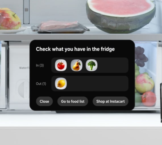 ∞AI Vision Inside can recognize and automatically label 37 unobscured fresh food items such as select fruits and vegetables; other items may be manually labeled. Results vary by manner of placement. Bixby and personalized recipe recommendations accessible through the AI Home utilize AI based on deep learning models.