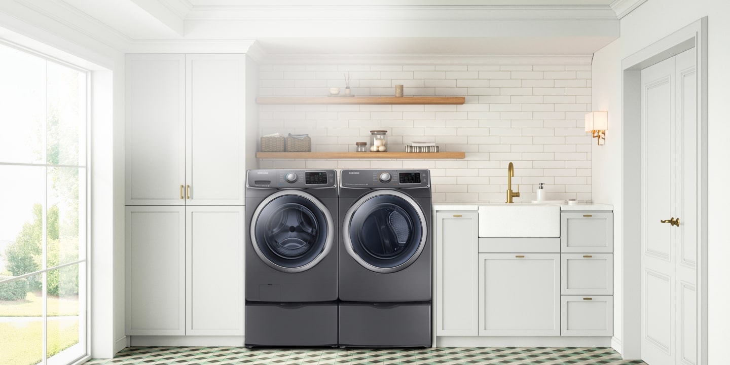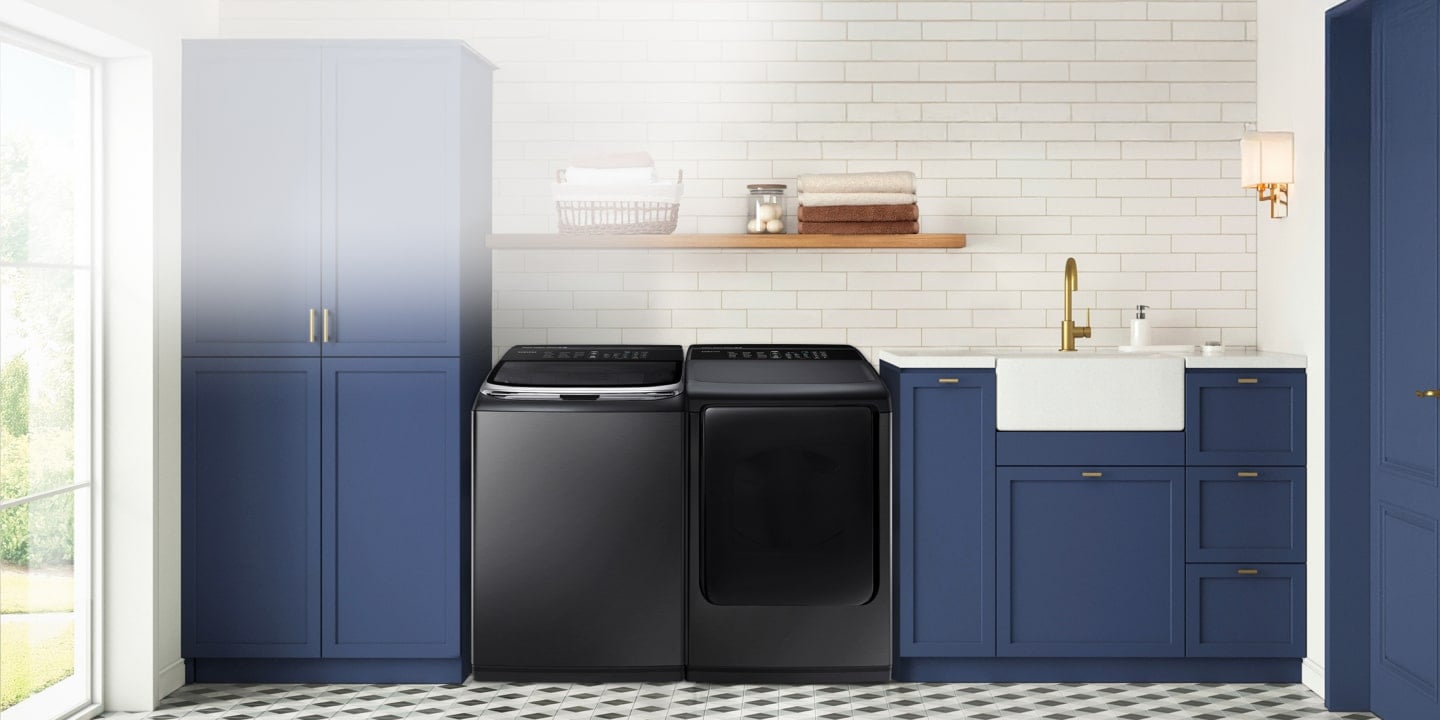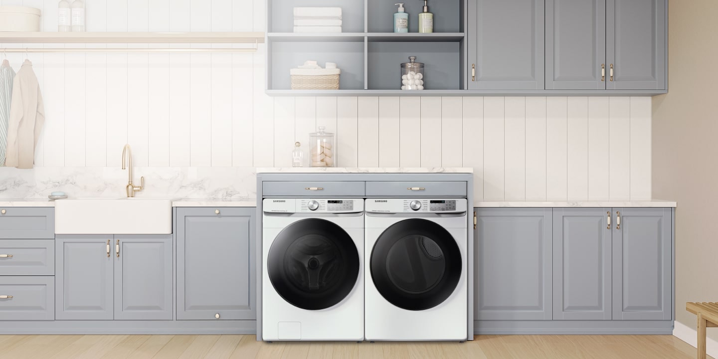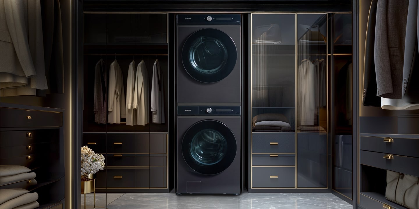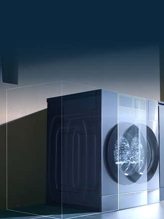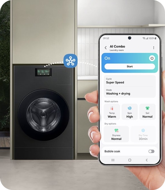 ⁵AI Home LCD touchscreen on Laundry Combo accesses AI Opti Wash & Dry sensing and Bixby based on AI-based algorithms. Wi-Fi connection and Samsung account required.