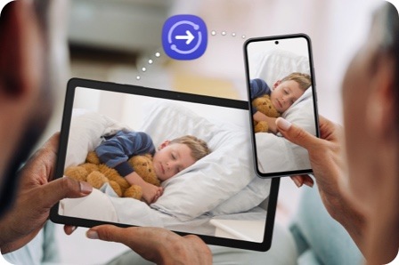 8Smartphones and tablets with Android OS version 10.0 (Q) and One UI 2.1 or above, PCs running Windows 10 or later. Requires Samsung account and Wi-Fi and Bluetooth connection. Quick Share to iOS and Android devices available by sending shared link: individual files shared cannot exceed 3GB (for a total of 5GB per day) and link will expire after two days; requires a Samsung account and internet connection.