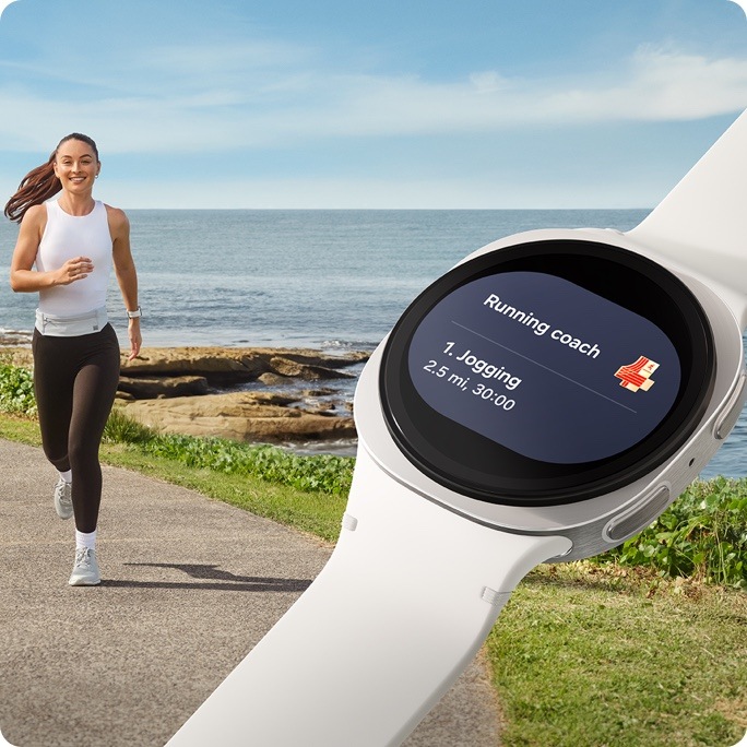 3Available for outdoor running only; requires at least 12 minutes of running with GPS on and initial setup. Galaxy AI features track data and require compatible Samsung Galaxy phone, Samsung Health app and Samsung account.