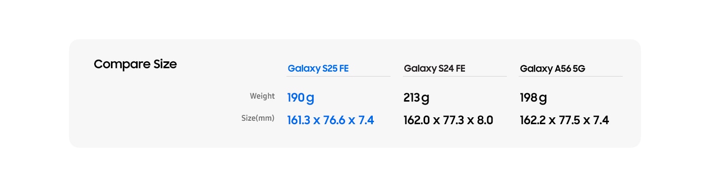 At 7.4 mm thin and weighing only 190 g, Galaxy S25 FE is the thinnest and lightest FE phone yet. Our slimmest bezels to date are paired with a floating camera for a more immersive viewing experience.2,3