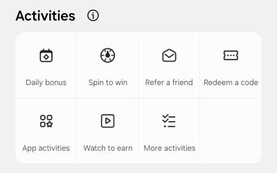 - App activities: Explore featured apps and earn rewards along the way! Whether you’re installing something new, opening an app you already have, or leaving a rating to support your favorites, every activity brings you closer to more rewards. Just make sure the app comes from Galaxy Store for your activity to count. App events for the same app may appear more than once, so keeping the Galaxy Store version installed ensures you never miss out. Activities refresh weekly, giving you new opportunities to earn.
