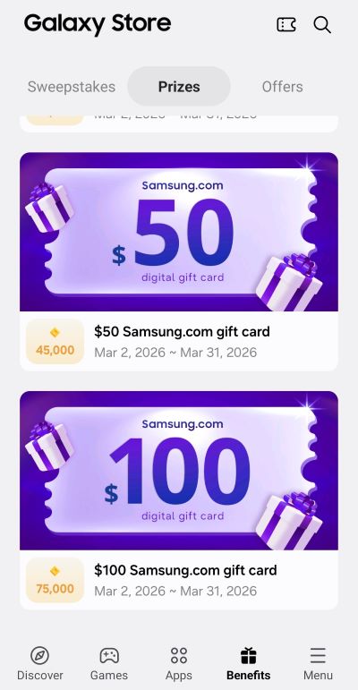 In the Galaxy Store on your Samsung phone, you can go to the Benefits tab, scroll down below the Activities section, and tap the Prizes section to see what options you can choose from.