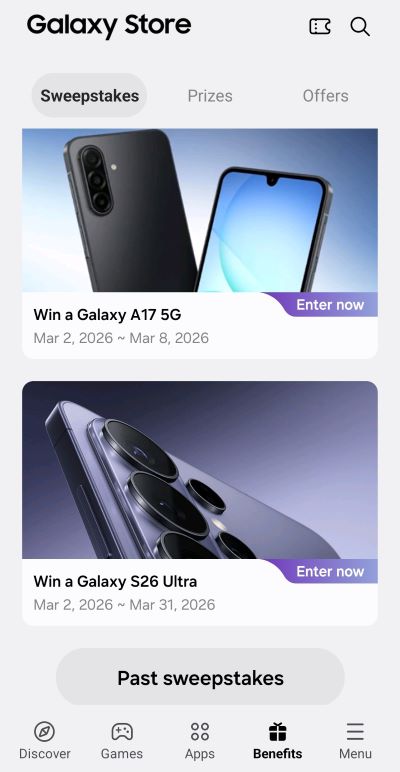 In the Galaxy Store, tap the Benefits tab, and scroll down to locate the current Sweepstakes. Remember to come back daily to try and win Samsung gear from Daily Instant Wins, Weekly Giveaways, and Monthly Mega Prizes.